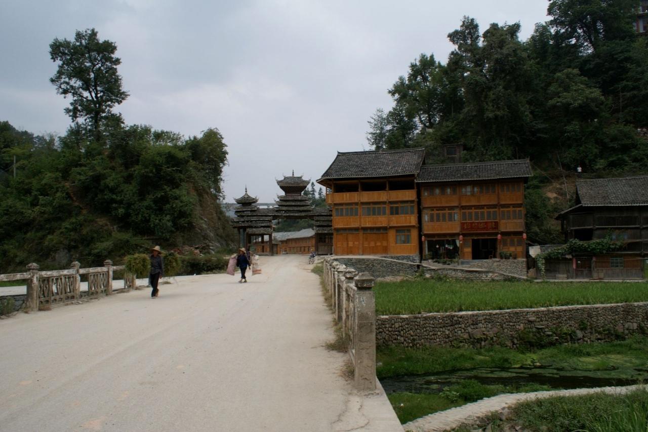 中学校から降りたところの風雨橋から集落を見る。