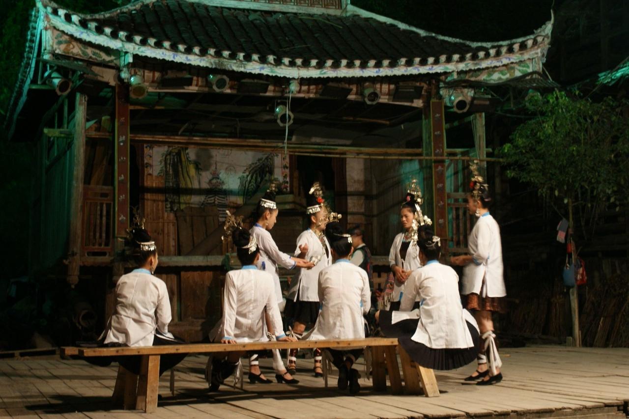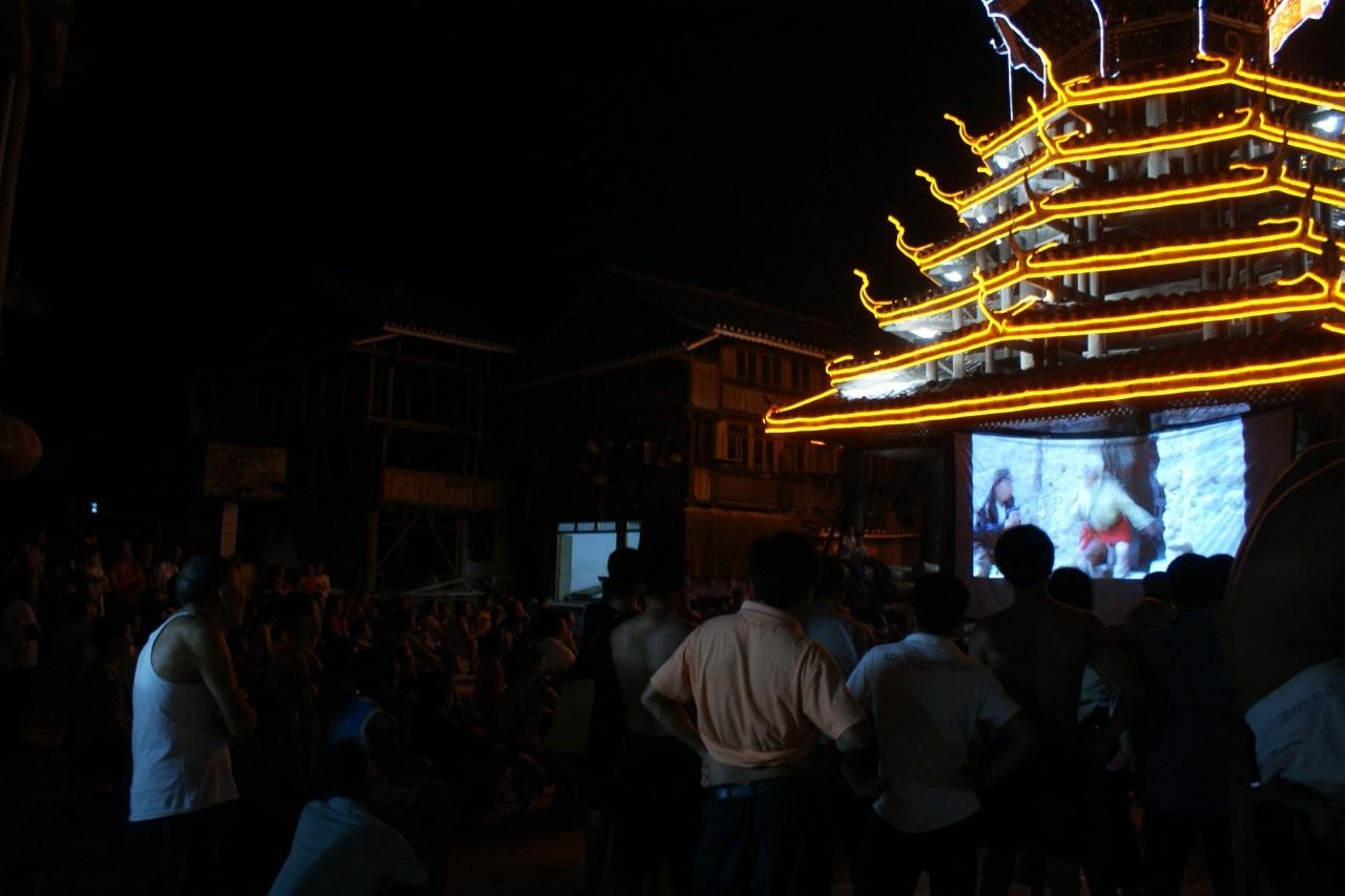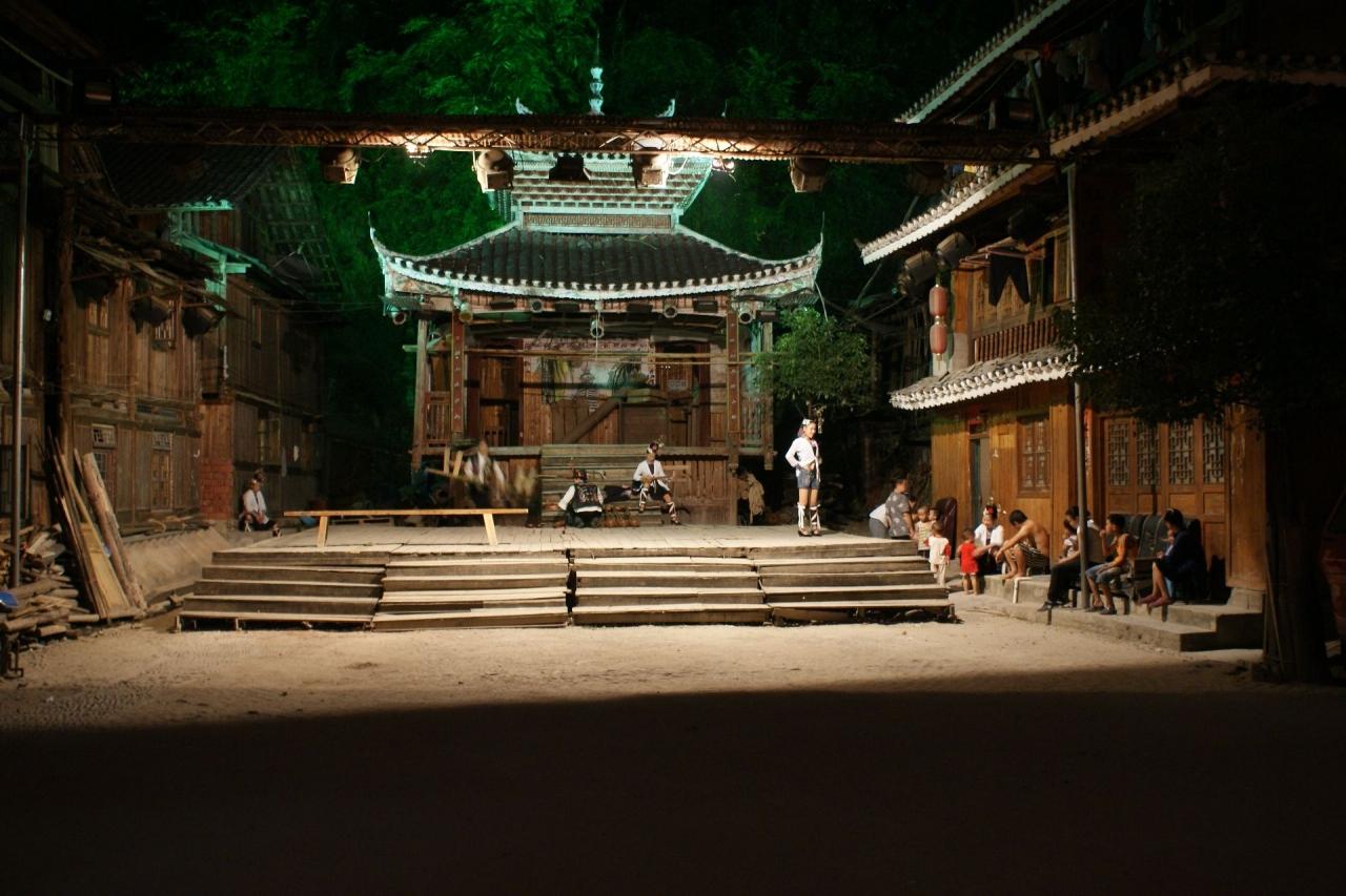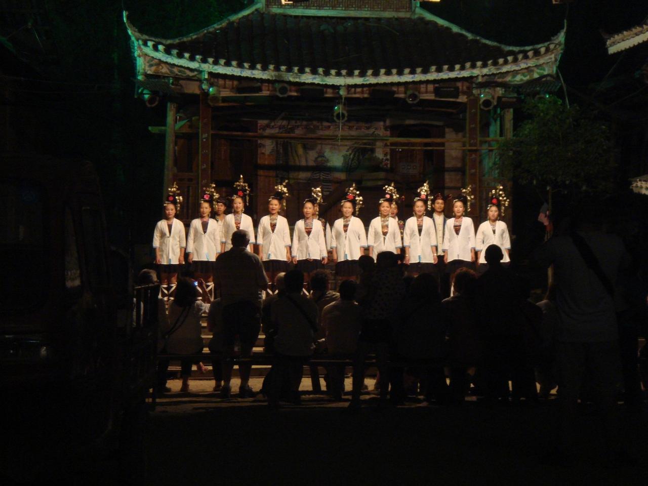 トン族を代表する村、肇興。この村の夕暮れを散歩した後、鼓楼の戯台の前で演じられる歌の民、トン族の表演を遠くから眺めた。なんせ目の前の椅子席は50元の有料だから…