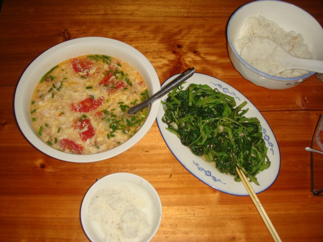 飯にしましょう。食堂で空心菜を炒めてもらいました。