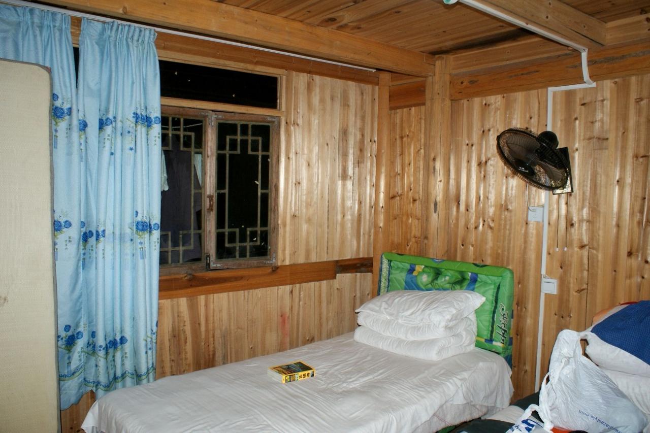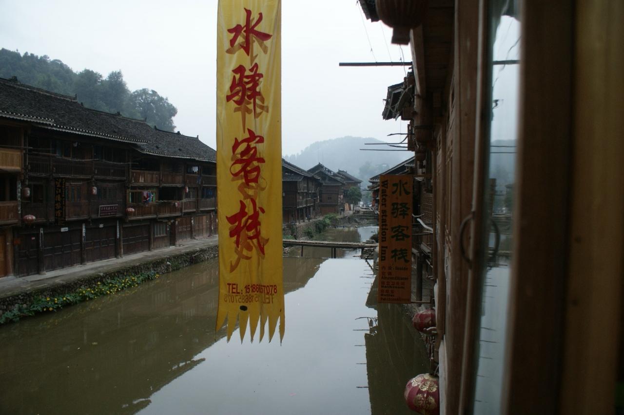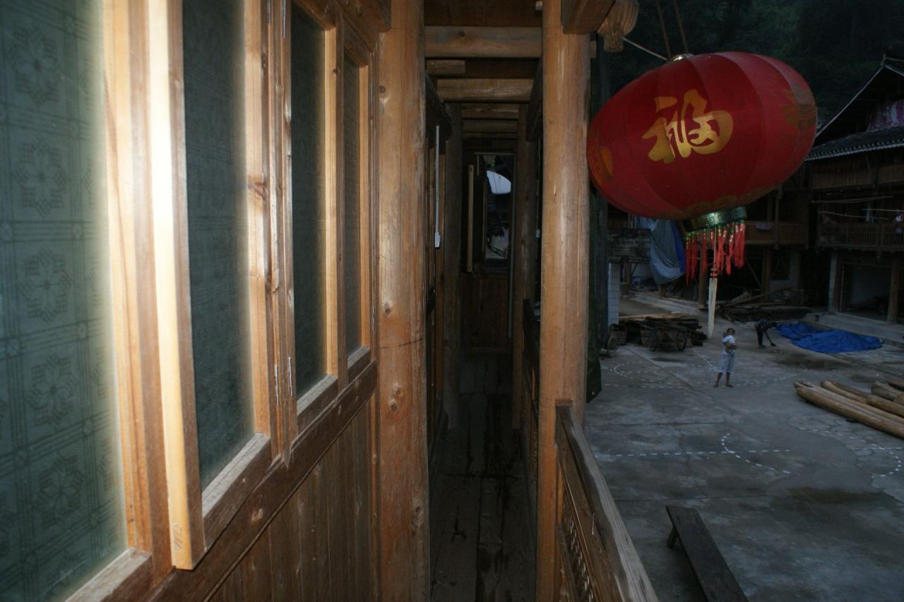 部屋の外の廊下は吊脚楼のせがい部分なんでこんなに狭くて、ザックを背負っていると通れません。