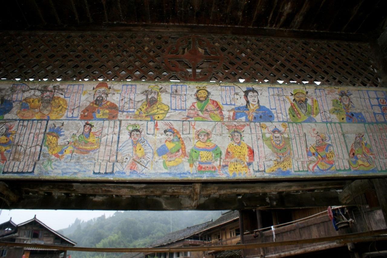 面を被った人たちの絵が義団風雨橋の軒下に描かれてました。。