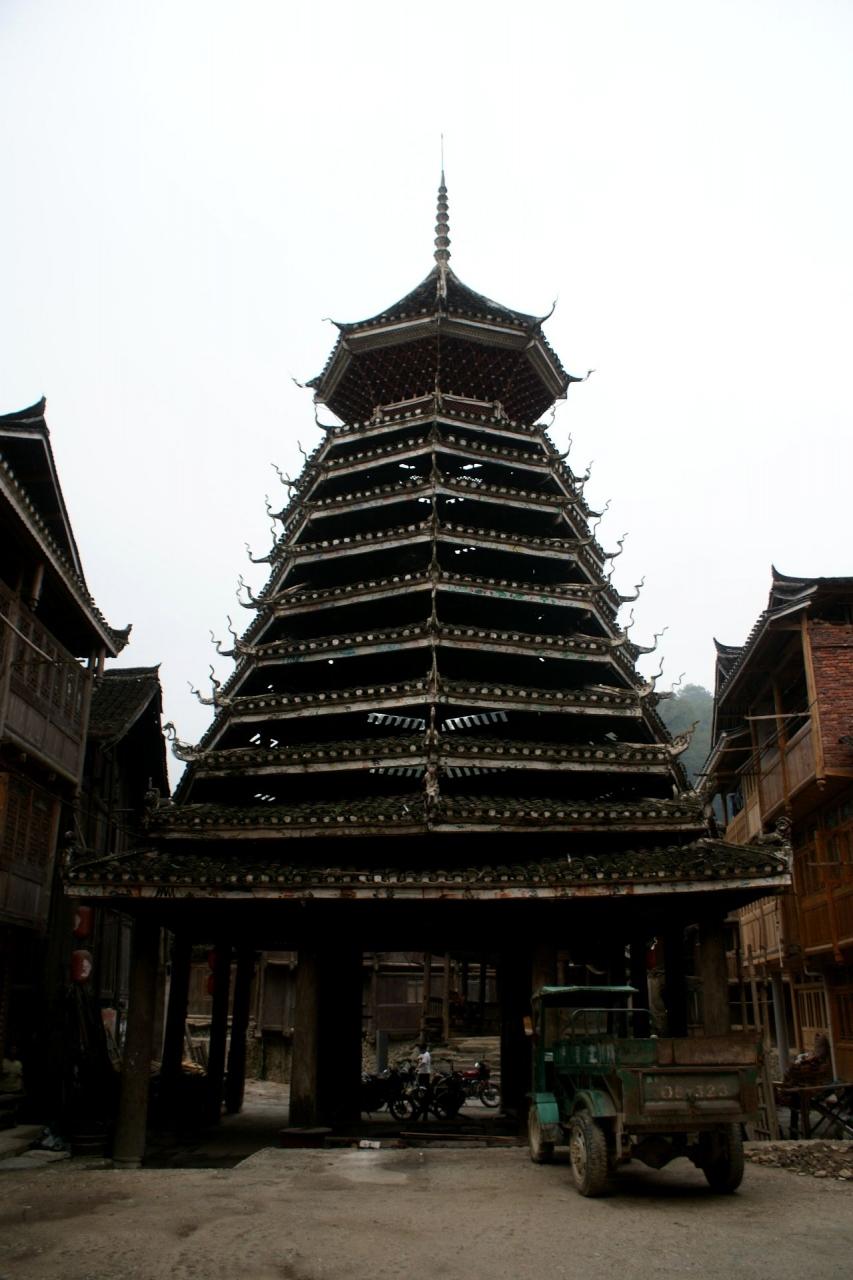 鼓楼は真ん中に4本主柱、周りに12本の支柱で支えてます。 -