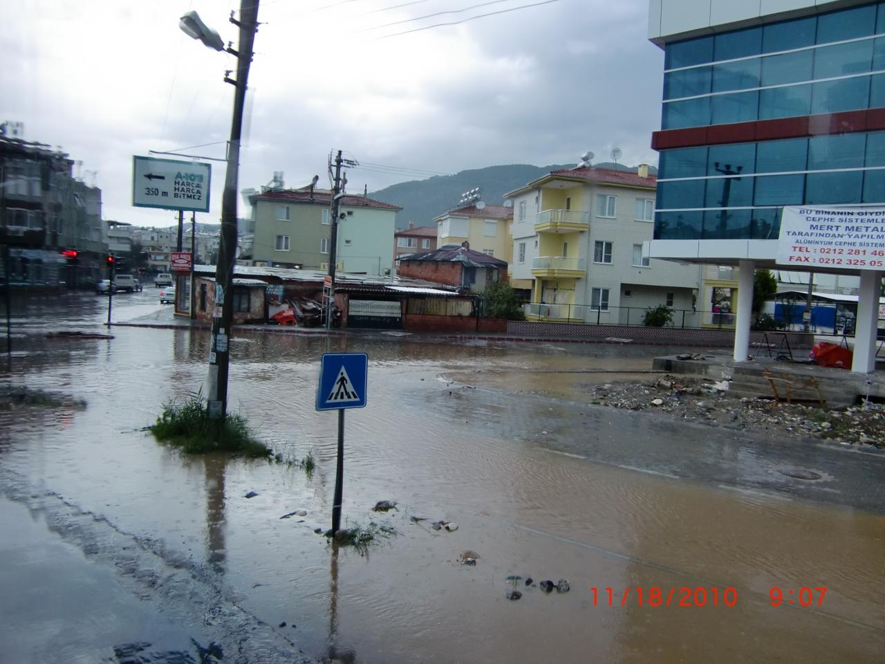 町中ですが道路が川のようです。だいぶ降りました。