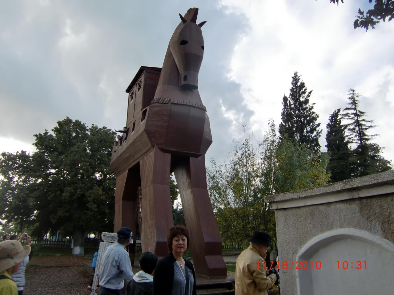 木馬の中からギリシャ軍の兵隊が何十人もぞろぞろ出てくるのです。この木馬には何人もの観光客が入り、窓から手を振り写真を撮っていました。 -