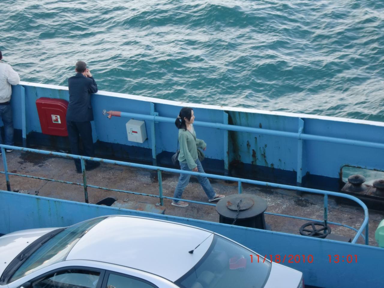 若い日本人女性がそろそろ降りる準備でしょうか。急いで船室へ向かっています。