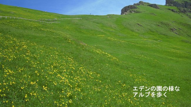高山植物の花が咲き誇るアルプ(牧草地)を気持のよい風を感じながら歩く。