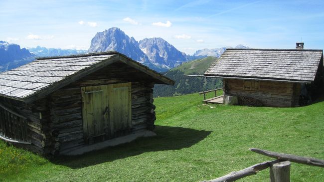オルティゼーイから東側に走り、ロープウェイでガルディナ峠(標高2121m)へ登る。ドレミテの独特な岩山と草原が素晴らしい。