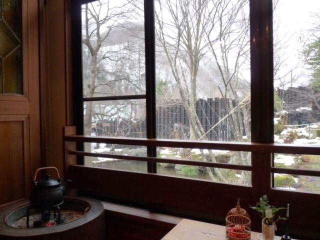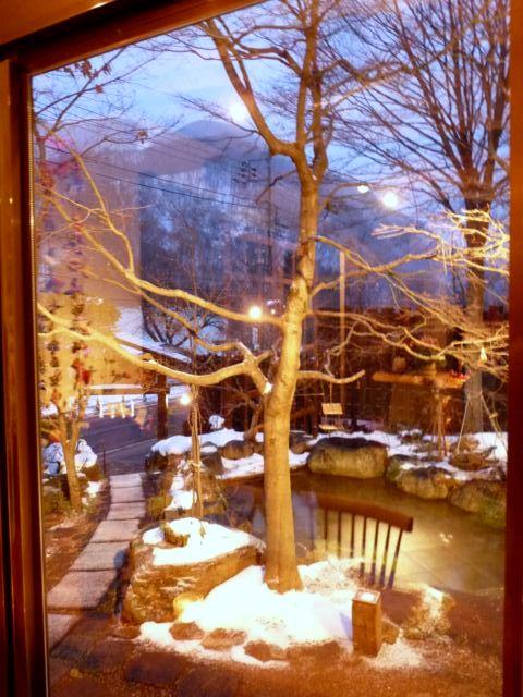 ガラスの向こうにはうっすらと積もった雪と