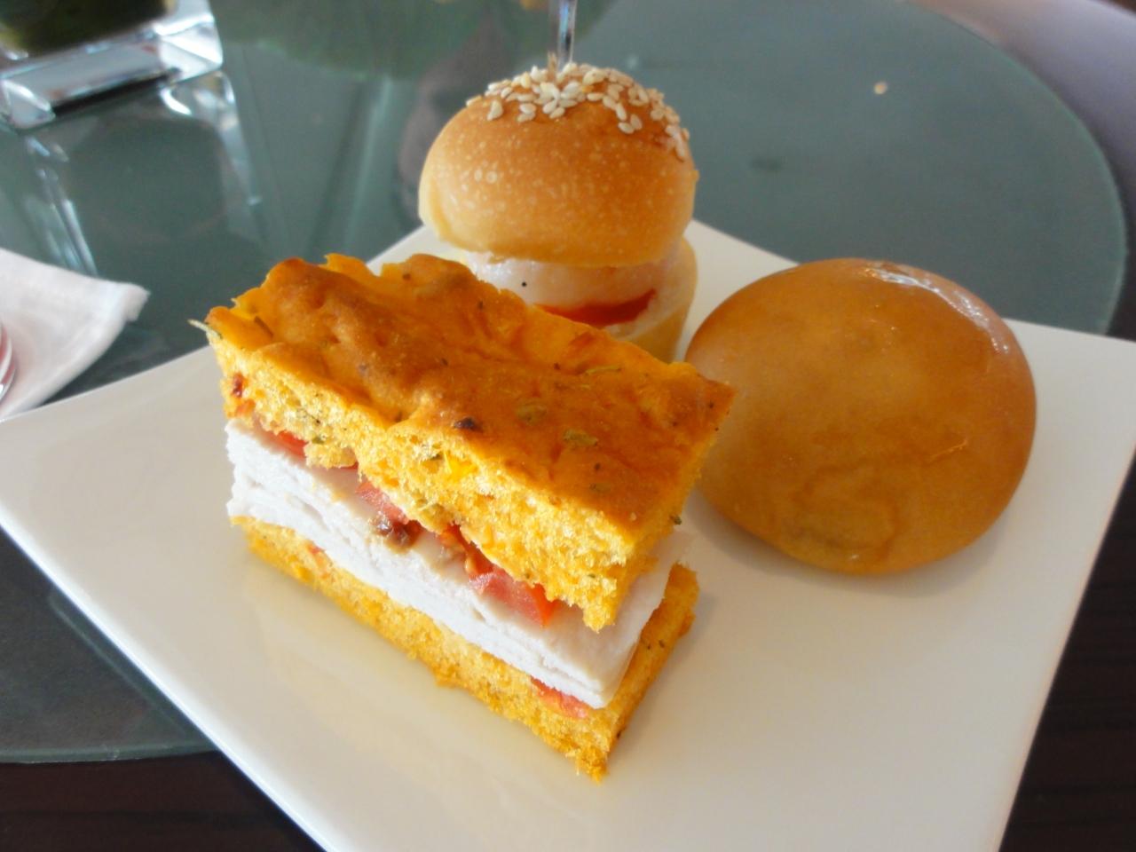 手前もケーキみたいにきれいですが、お野菜(たぶんニンジン)のパンにスモークチキンみたいなのとトマトなどが挟んであるサンドイッチです