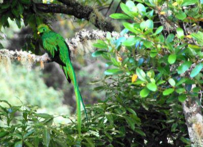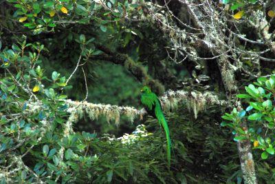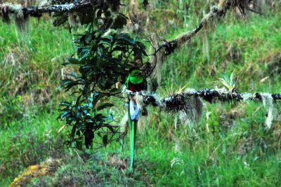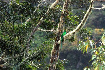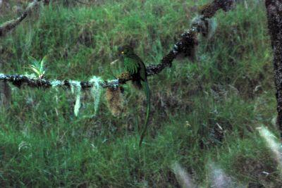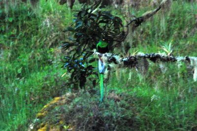 ガイドさんが3本の木を指差し,「あそことあそこと,そしてあそこに出やすいので,注意してみましょう.」と言った.で,そのうちの一番近い一本を見ると,何かがやってきた.出た.あっけなく出た! ケツァールだ.鮮やかな緑色!! ただ暗くて写真がなかなか撮れない.