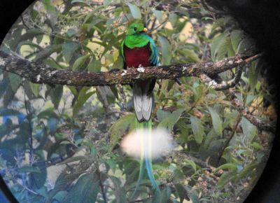 別の枝に移動したとき,ガイドさんが持っているフィールドスコープ越しに小型カメラで撮ってみた.尻尾の反射が残念だが,いやあ,美しい! 静かにしていないといけないのだが,だいぶ興奮してしまった.