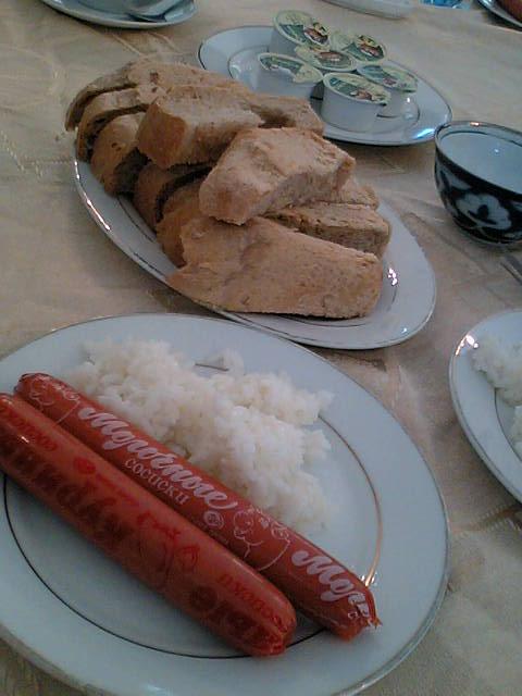 ご飯、スーセージ(牛・鳥)、パン、ガス入りウォーター、お茶。