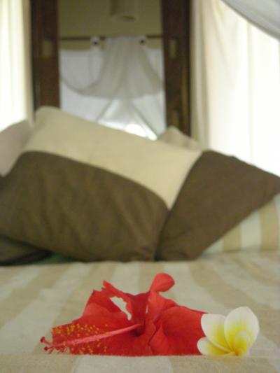 電気ではなくろうそく。その横にはフランジパニ。すてきです。