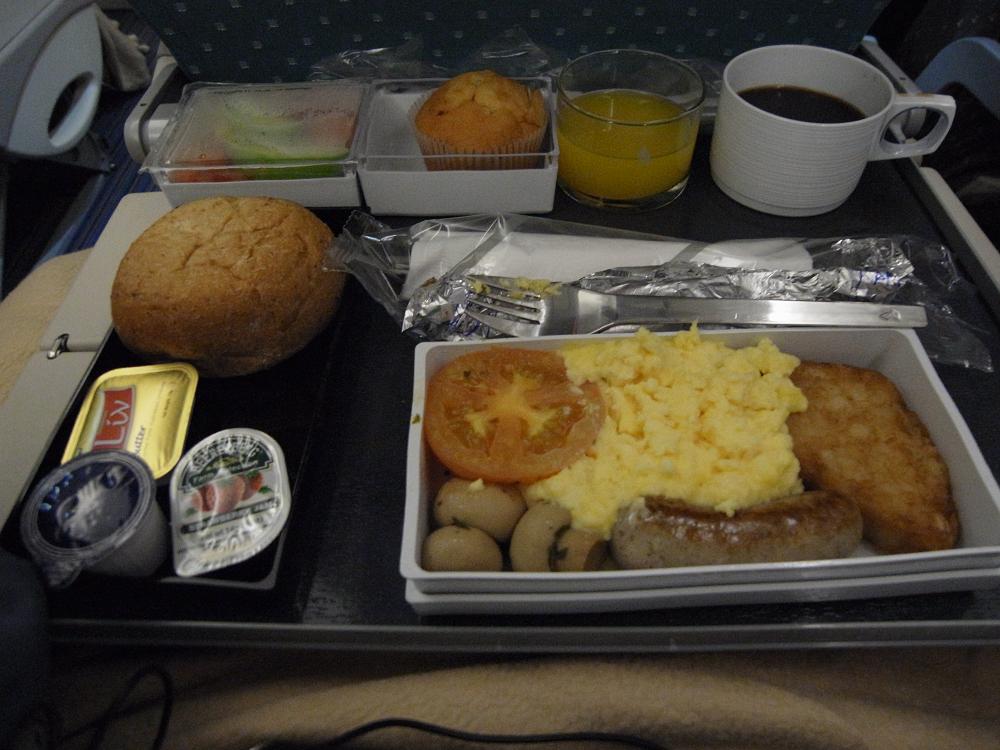 一眠りして気が付いたら朝食の準備で電気が点きました。ソーセージを選択しました。熱々で美味しかったです。今回の旅もあと1時間で空港に着き2時間ほどで帰宅です。色々ありましたが楽しい年末年始の旅が出来ました。