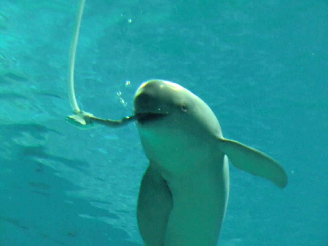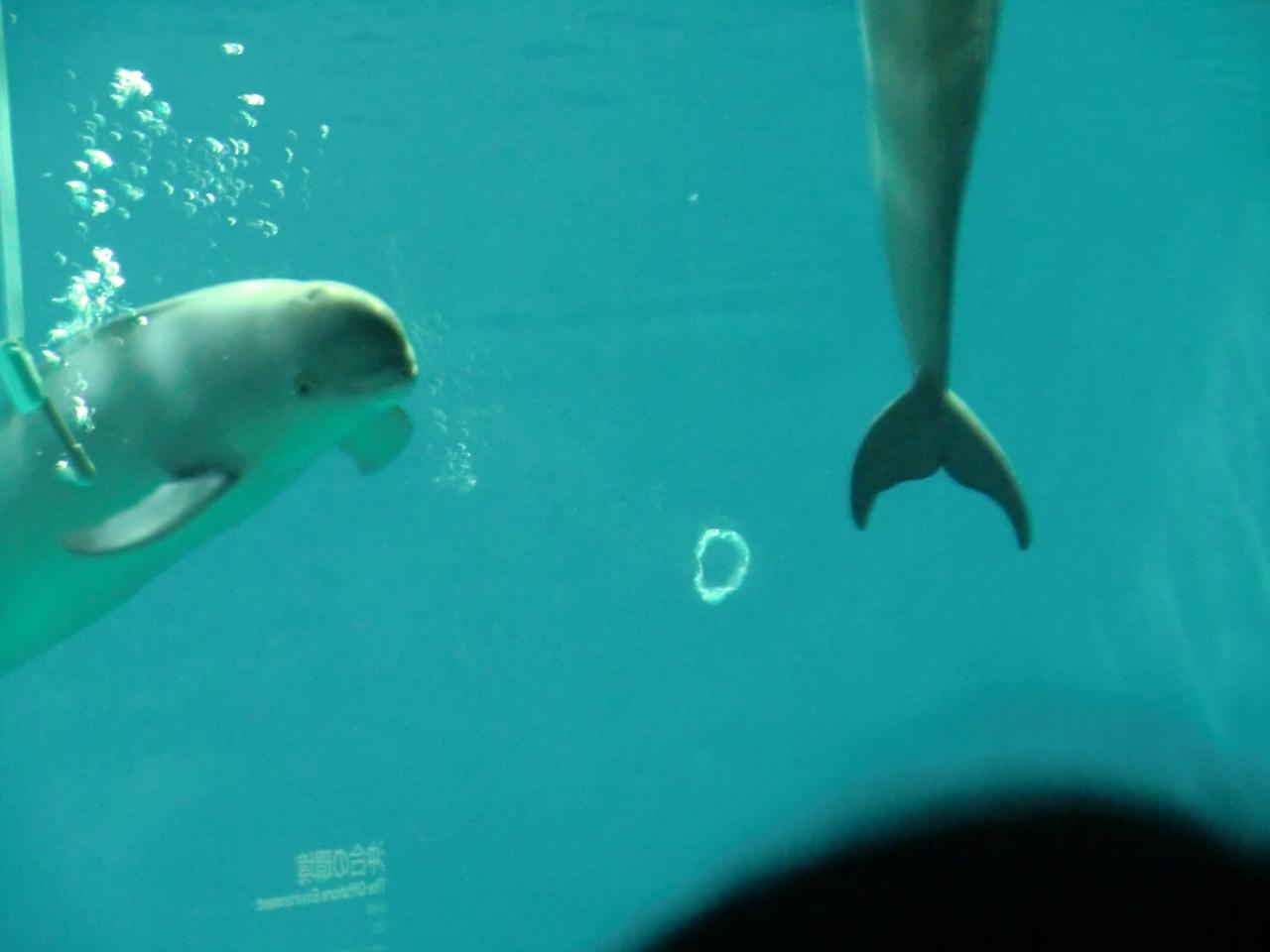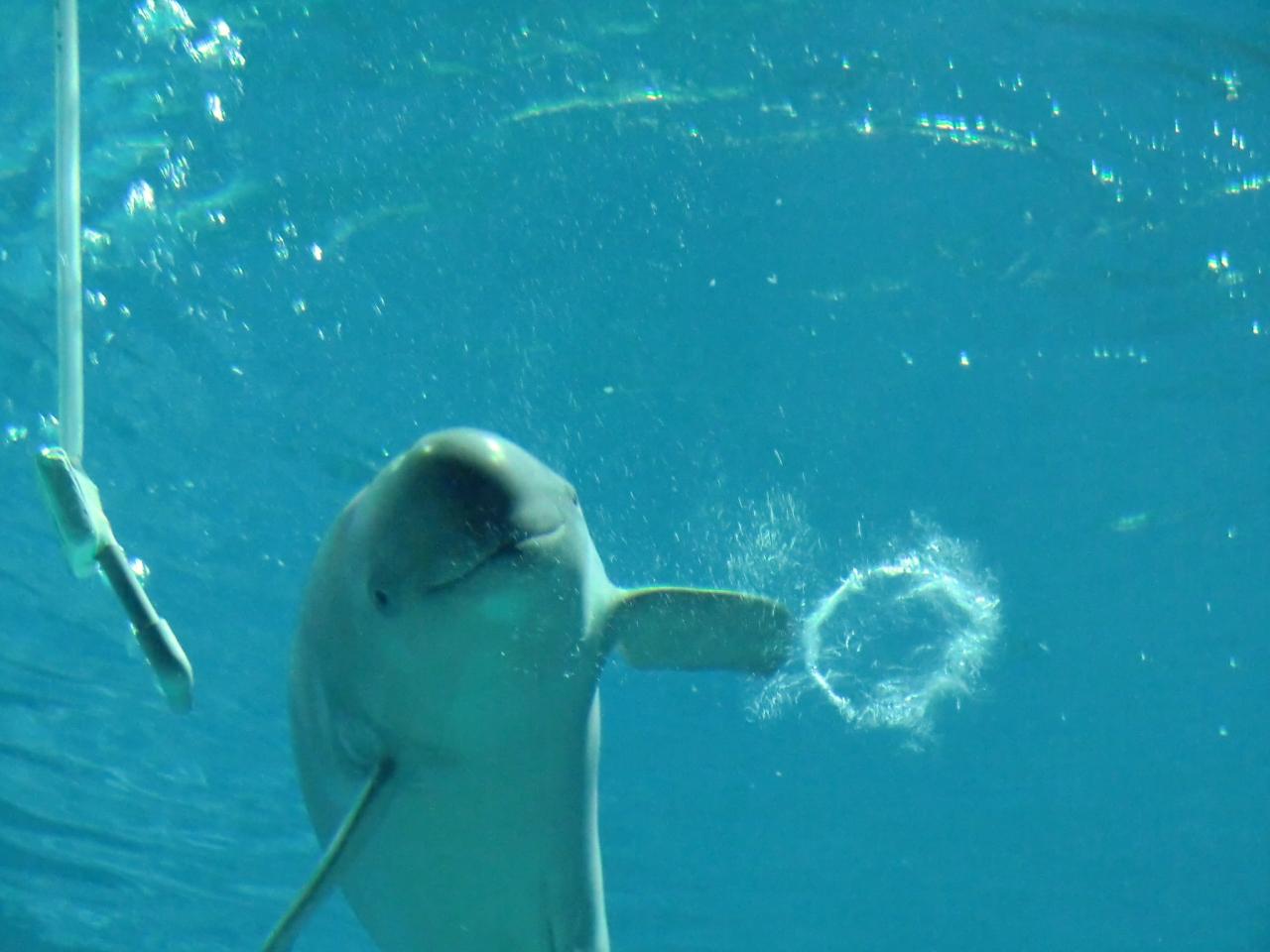 バブルリングは、砂地の中にいる餌をとるために、空気を吹きかけて砂を飛ばすというスナメリが自然にやってることだそうです。 -
