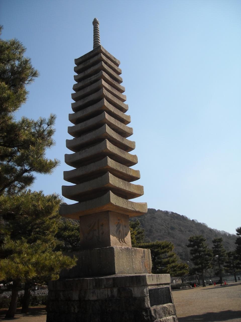 十三重石塔。塔の島にどどーんとそびえ立っています。