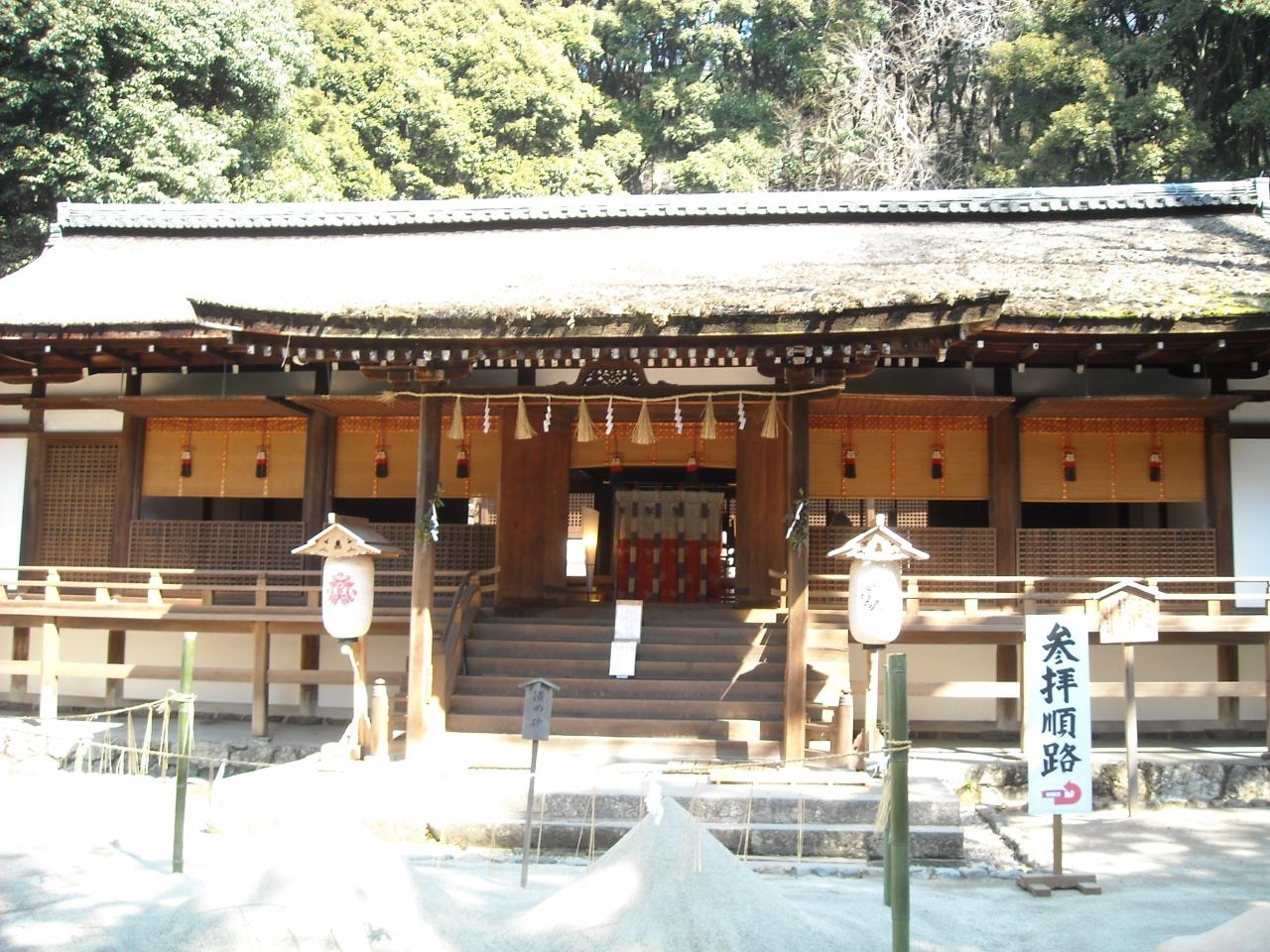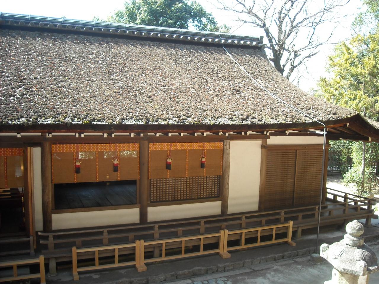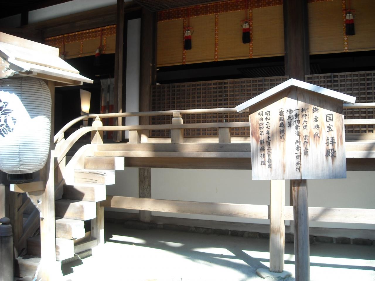 境内正面の拝殿(国宝)は鎌倉初頭のもので、寝殿造りの様式を伝えており、特に「すがるはふ」といわれる手法を用いた屋根の美しさは格別だそうです。