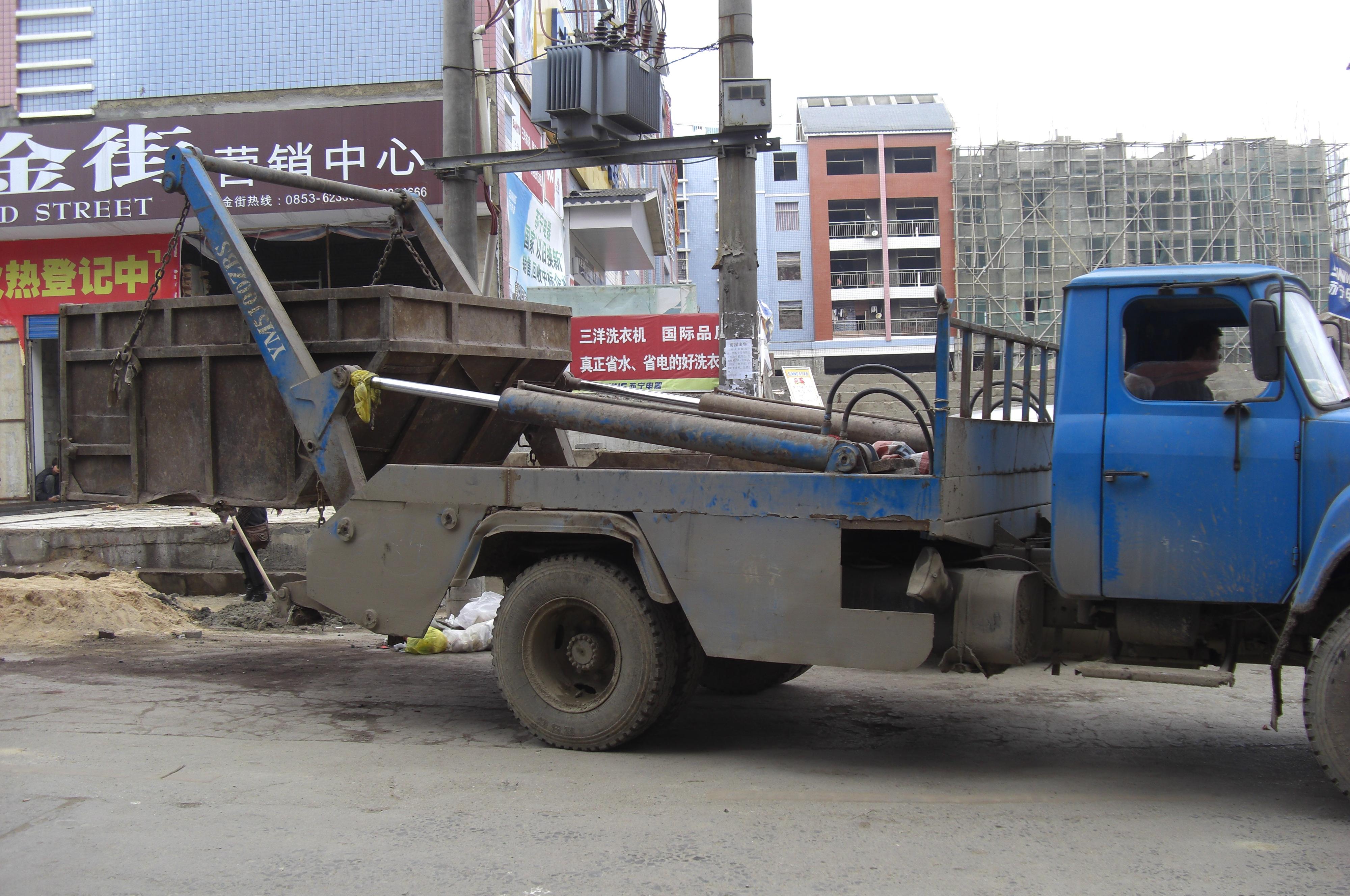 これはゴミ桶運搬車なのか?街中でたまに見かけるこの鉄製のでかいゴミ箱?中にはいつもゴミがたくさん入っているので私はゴミ箱だと思うんだけど。こうやって運んでいるんだ。始めて見た。
