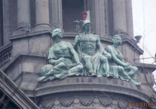 鐘楼基壇の東西両サイドの彫刻は、当時上海で最も優れた青銅彫刻と言われている。片側の彫刻は、キューピット、マーキュリー、ビーナスで、真中のマーキュリー(水星)は天上の神の使いとして人類に神の意思を伝える。両側の愛の天使は、郵便が人類に愛を伝え、愛が成就することを象徴していると言われる。もう一方の3体の彫刻は、各々両手に郵便の輸送手段となっていた初期の汽車、汽船の錨、通信用ケーブルを握っている。それらは設計者の美意識を表すと同時に、国民の親書伝達吏として、送信者に対する公平なサービスと、人々が通信により連帯感を持つことを象徴している。合理性だけが優先される現代から見ると、今より85年も前に、こうした格調高い建築物を造る時代の精神に感動を覚えざるを得ない。