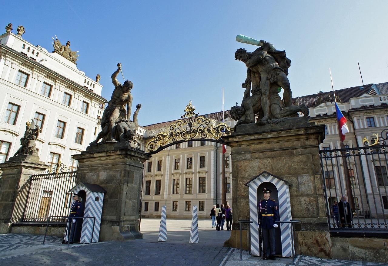 プラハ城正門から中に入りますが、門柱の上には「闘う巨人像」と呼ばれる2体の像が置かれてあります。現在の物は20世紀初頭に造り替えられたのもですが、オリジナルは1770年に彫刻家のイグナーツ・ブラツェルによって制作されたものです。
