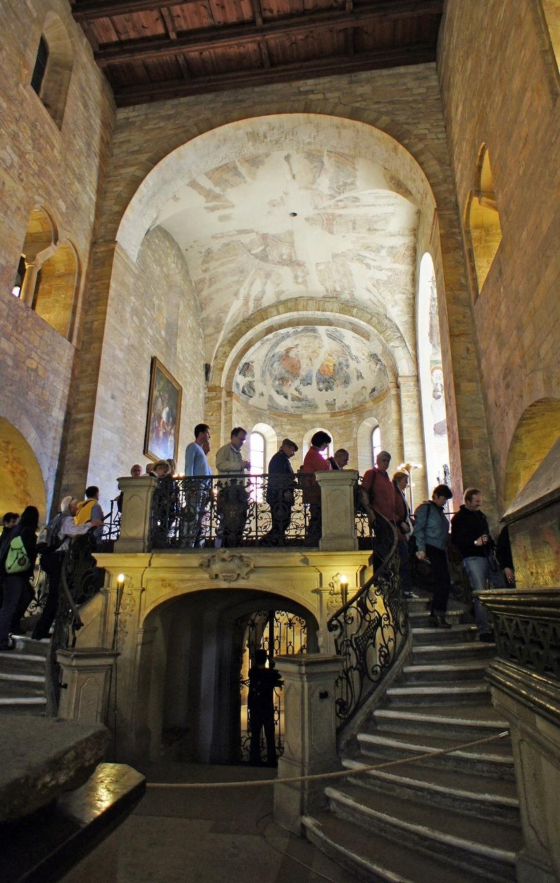 「全聖人礼拝堂」も意外にシンプルでした。後陣の中2階のような場所から眺めるだけです。元々はロマネスク式礼拝堂があった場所に建築家ペトル・パルレーシュにより建てられたもので、かつて教会にはパリのサント・シャペルを模した素晴らしい装飾が施されていたそうです。1541年の火災以後は当時のものとしては外壁しか残されていません。