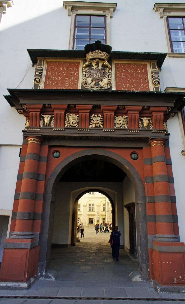 スイス門は1552年から宮廷建築家のピエトロ・フェラボスコによって造られたとされ、門の上部にはフェルディナント1世の名前がラテン語で銘打たれています。門を潜った内側の天井にはオーストリアの紋章がフレスコ画で描かれています。
