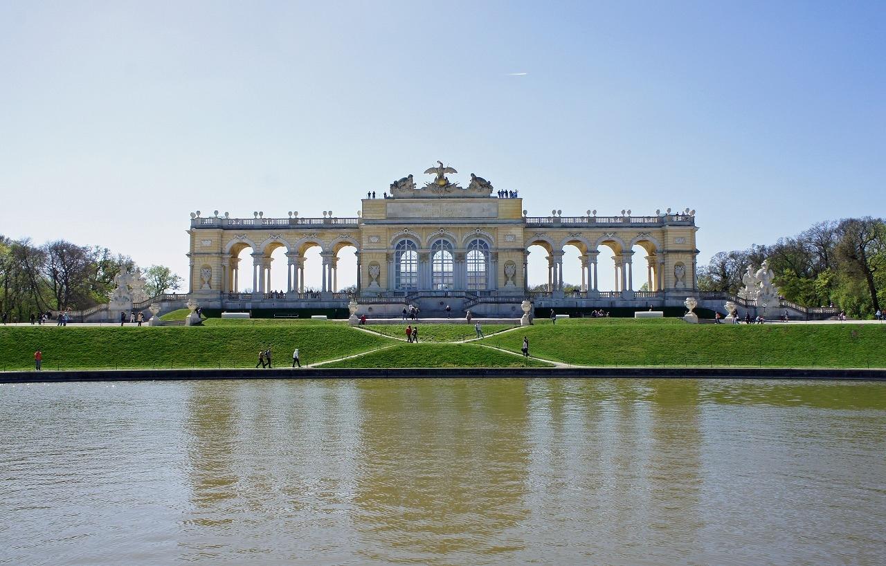 宮殿の高さからは分からない人口の池があり、グロリエッテが綺麗に見渡せます。「グロリエッテ」とは宮殿にある庭園のうちで周囲より高い位置に作られる建築物を指します。語源は12世紀のフランス語のグロイエで、シェーンブルン宮殿のグロリエッテは最大級で1番有名な建物です。