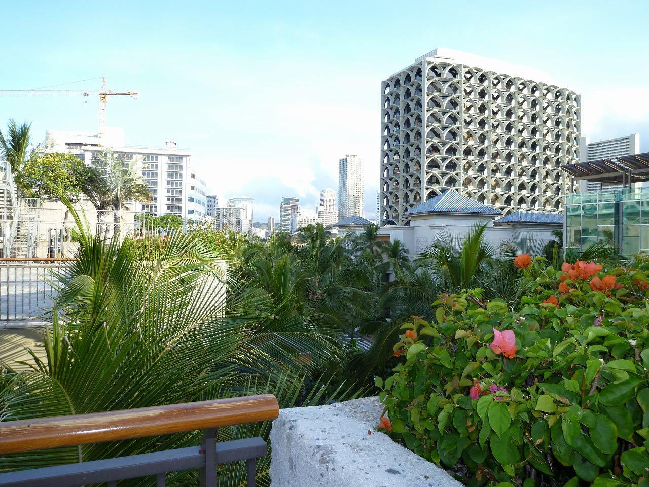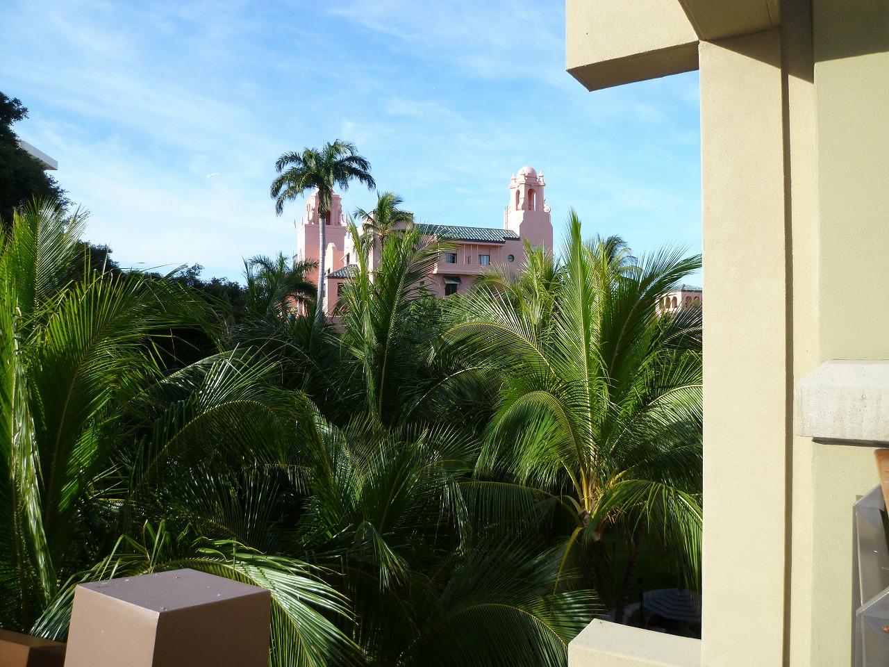 ピンク色の建物はロイヤル・ハワイアン・センター・ホテル。