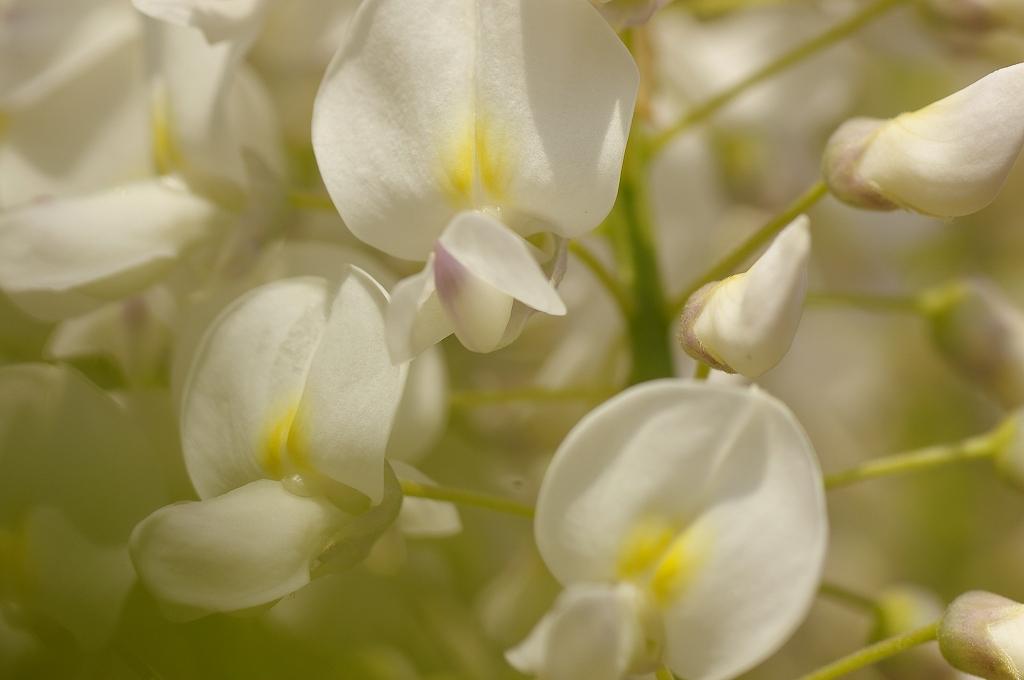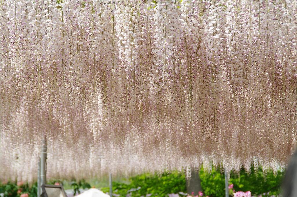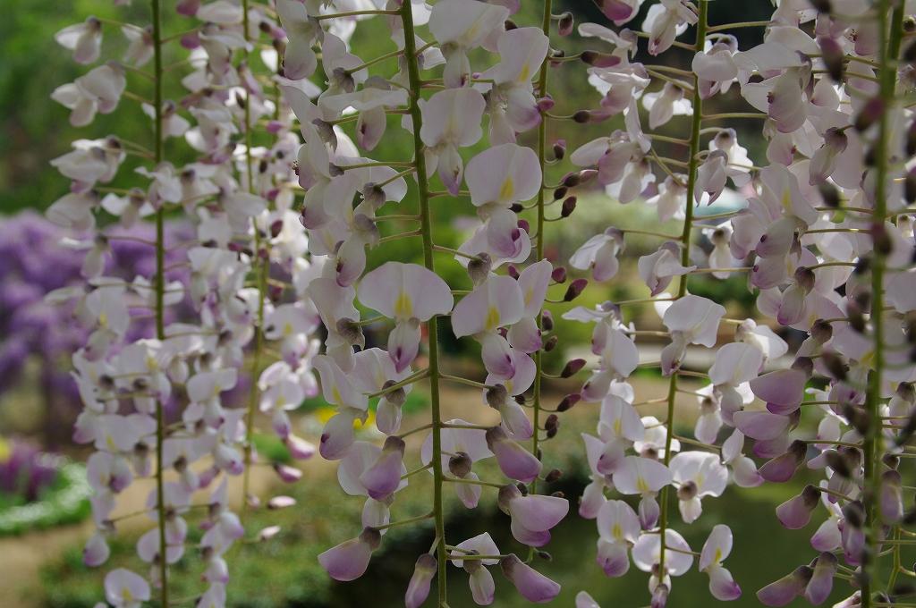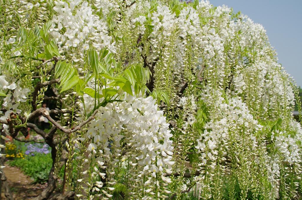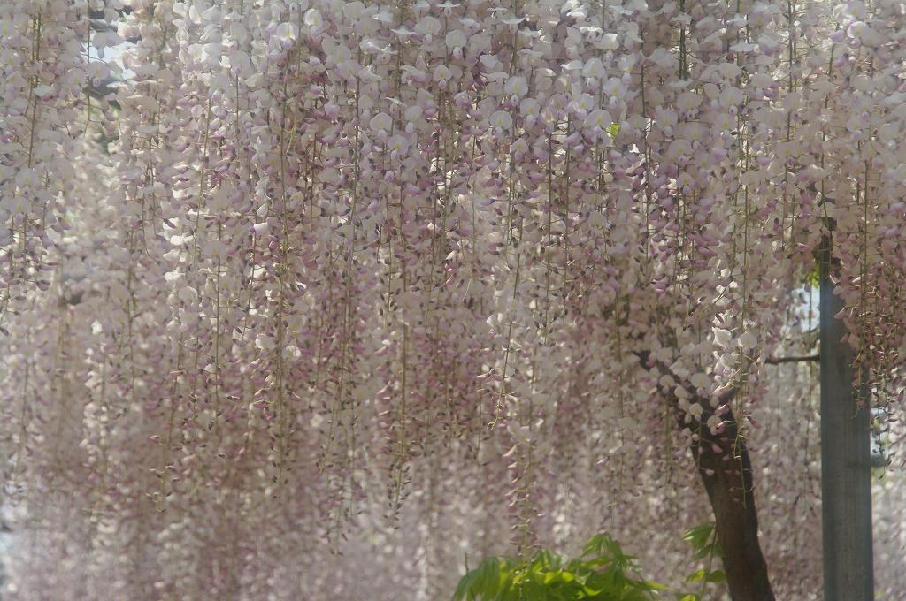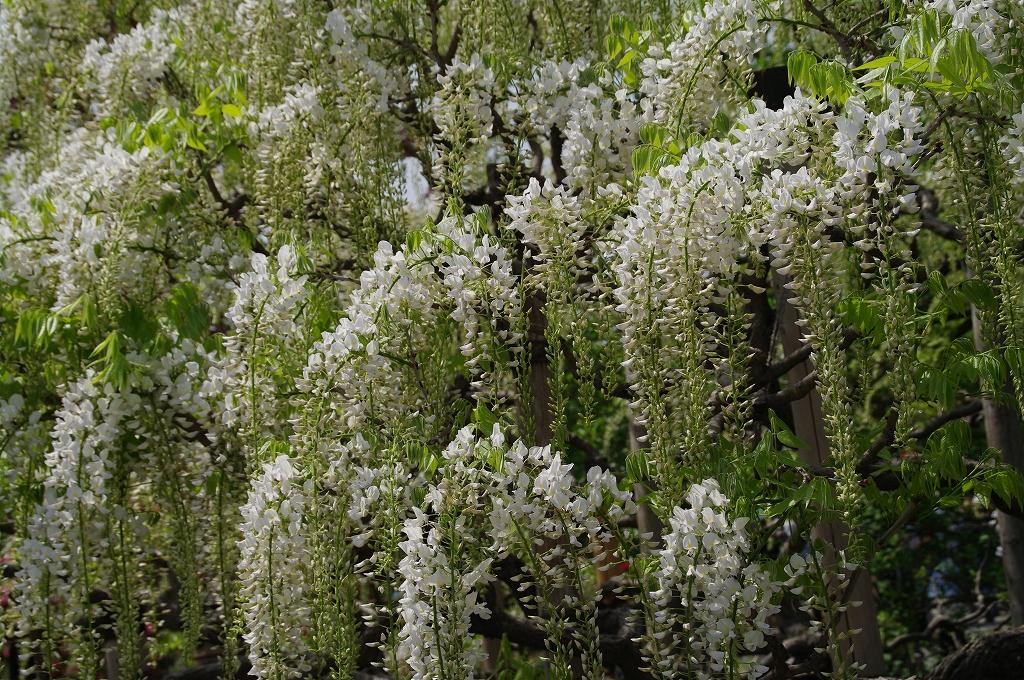 白い藤もあります。全長80mの白藤のトンネルはまだちょっと早かったのですが、部分的には清楚な白い花を咲かせていました。