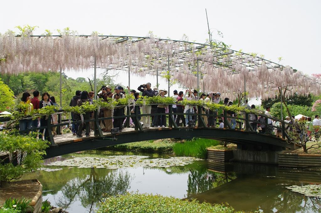 うす紅橋です。橋の上にはうす紅の藤が満開です。