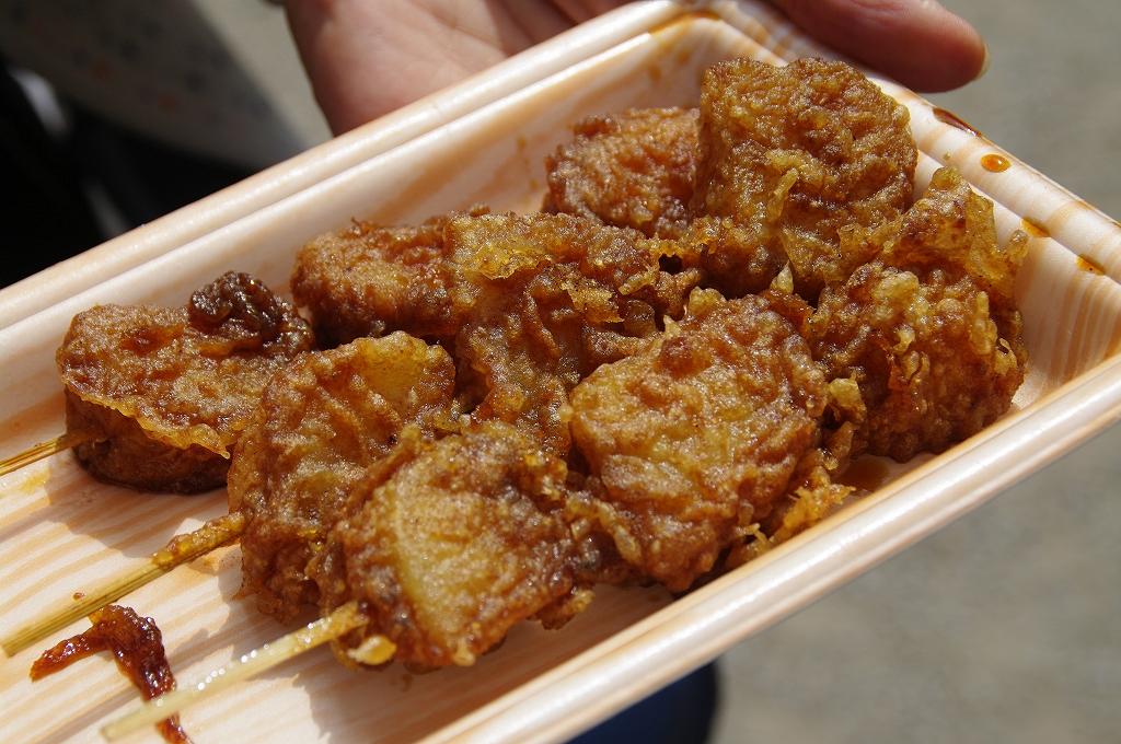 のりAさんが事前に調べてくれていた足利のB級グルメ「いもふらい」があったので食べてみることにしました。5本で300円と書かれてありましたが、1人一本60円でOKとのこと。3本揚げてもらいました。