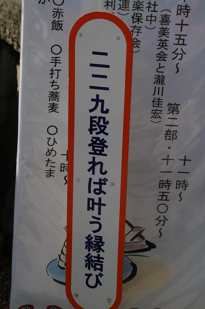 鳥居の向こうには長〜い階段が・・・「げ〜」って思ったら、すぐ横に「二二九段登れば叶う縁結び」という文字が・・・何が何でも登らねば!!!