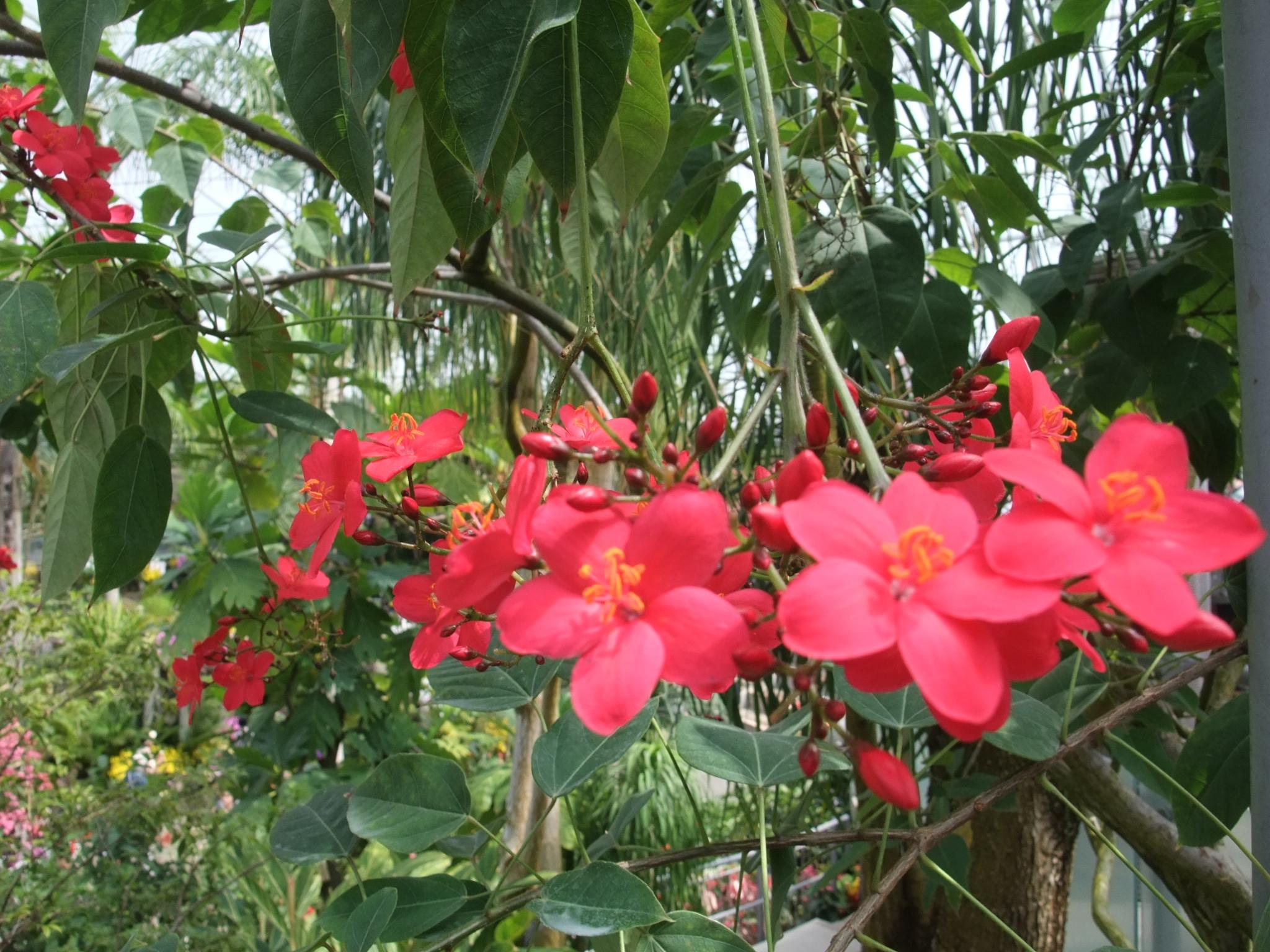 室内の温度は冬でも約20度に保たれ、ダイオウヤシ、オオギバショウといった熱帯・亜熱帯の植物が生い茂るなか、