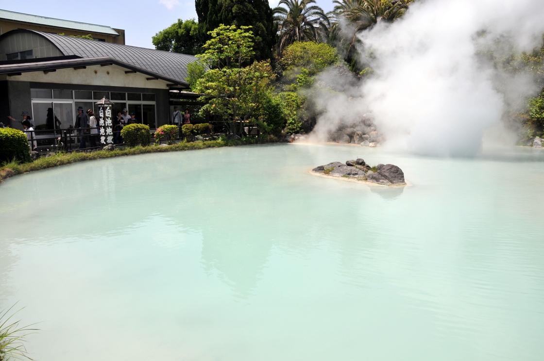 白い湯煙が立ちこめ、淡い青色を呈していました。