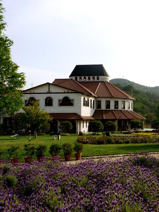 外にはヨーロッパ風の庭園が広がっています。