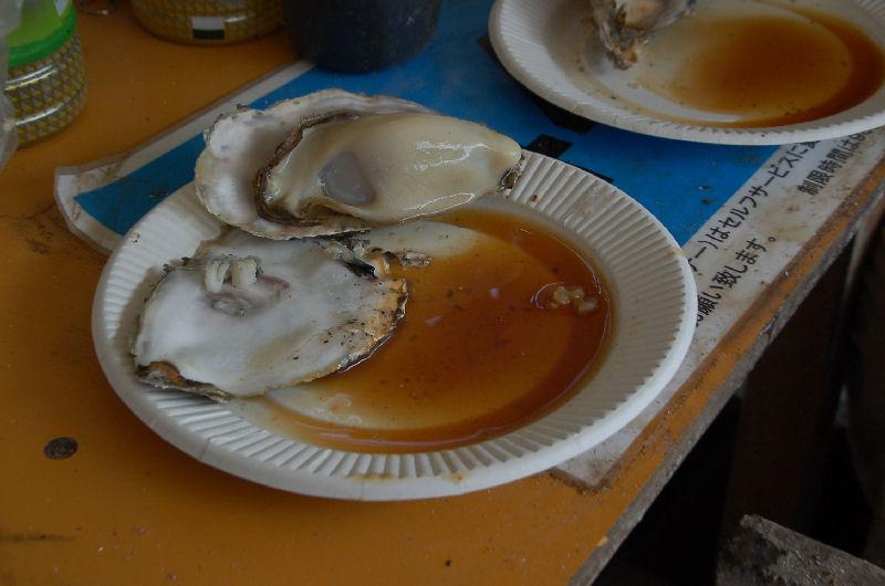 水産市場のようなところでビニール袋にいっぱいのガラ付き牡蠣を千円で購入した。