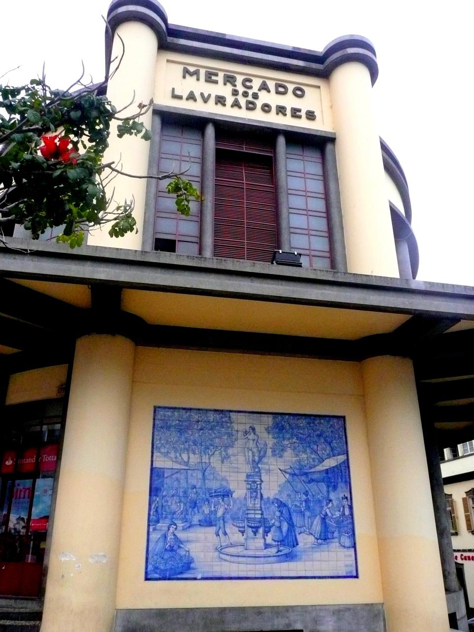 市場の建て物の中央の、市場の広場風景の描かれたアズレージョが架かる塔の上に、”ラブラドーレス市場”(勿論ポルトガル語)と書かれたサインが付いた塔が有る。