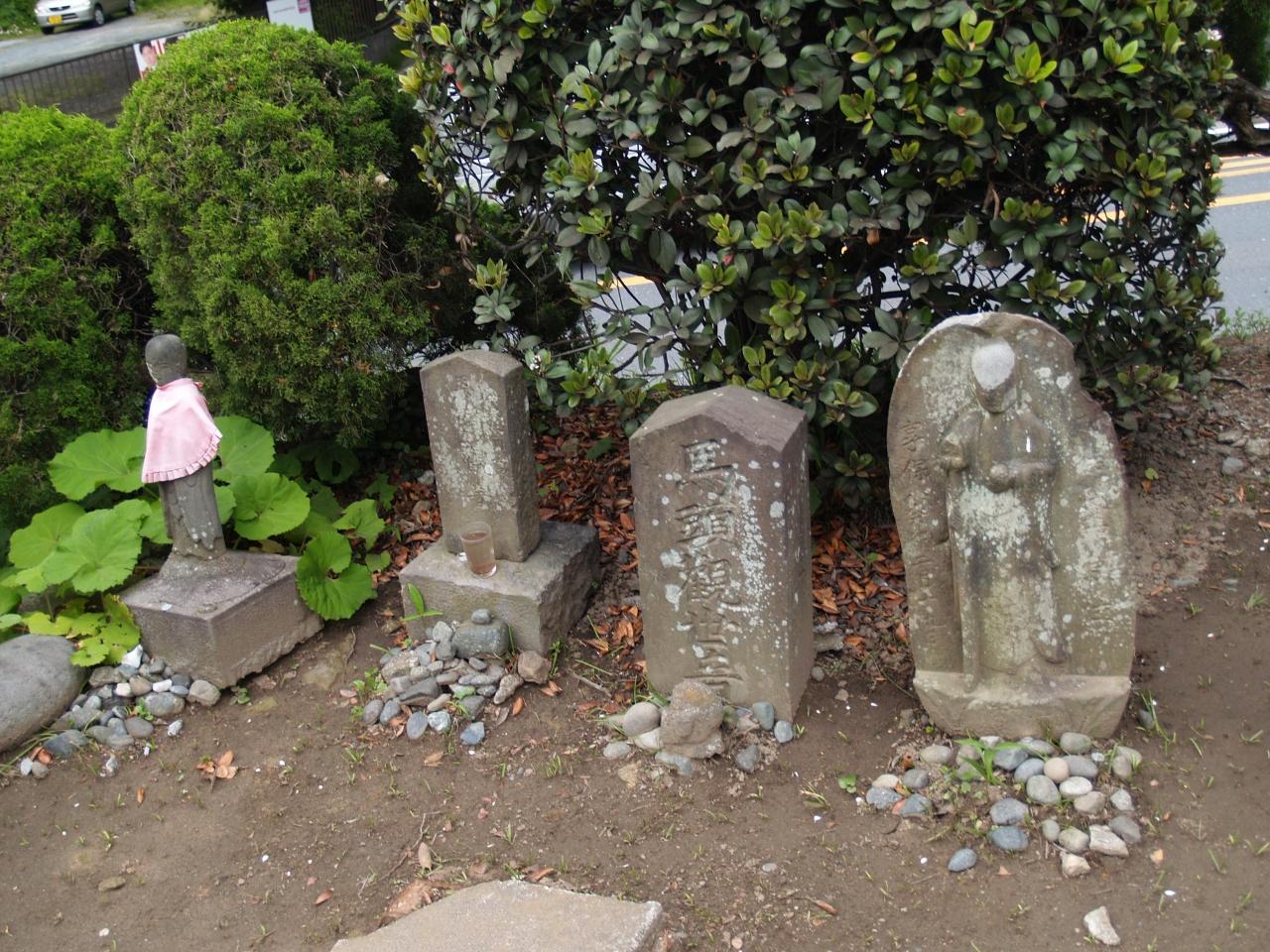 「この石仏は旧鎌倉道の木曽と赤坂の境の辻に行路の安全を願って安置されたもので風化が著しいが地蔵菩薩一体と如意輪観音又は聖観音二体であり、造像年代は江戸元禄頃と推定される。又、土地の性質から道祖神の役割も果たしていた。