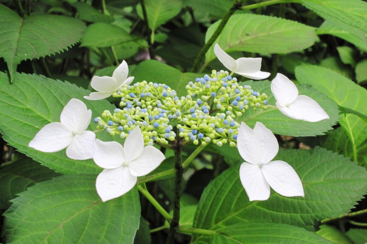 僅かに薄い青色が見えますが、白色と言っても良い紫陽花の花です。まだ咲始めです。