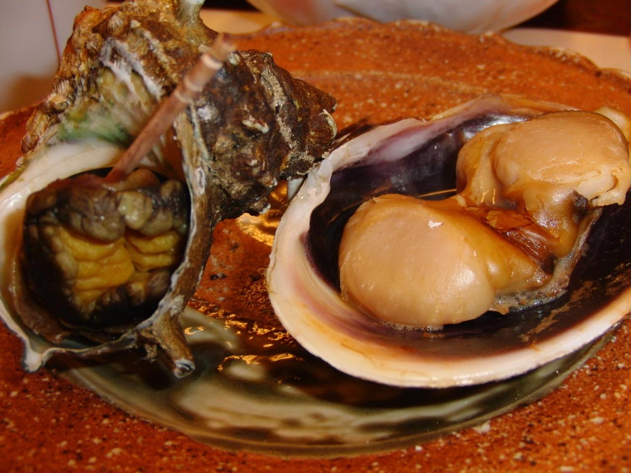 大アサリとサザエは網焼きで。醤油のこげた匂いがたまりません。