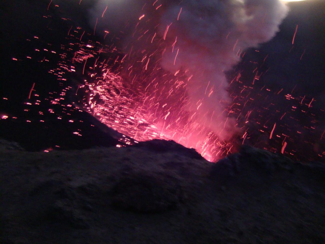 およそ6〜7分に1回爆音と共にマグマが噴き上げる様子を間近で見る事が出来ました。最初は恐ろしかったですが”凄い・凄い”と怖さも忘れて夢中でカメラのシャッターを押していましたが音との時間差も有り技術不足でした。帰りは懐中電灯を頼りに暗い道を無事に辿りつきました。