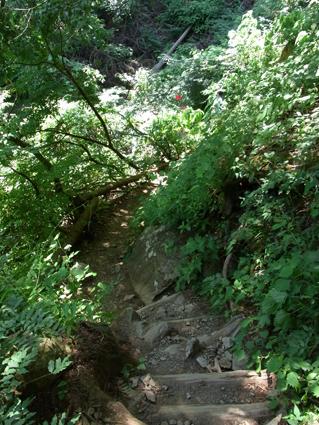 急な鉄ハシゴの道を休み休み登ると…