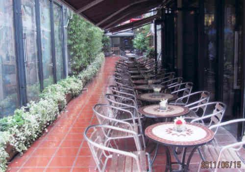 生憎の雨でせっかくのオープンテラスも客がいません。