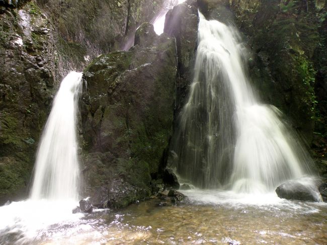 ブナやマツ、ナラの木々に囲まれ、まるで山水画に出てきそうな巨岩に囲まれて、神秘的で美しい渓谷の上流には落差20mの不動滝。ちょうど朝日が射し込み、マイナスイオンの水しぶきに反射して幻想的!