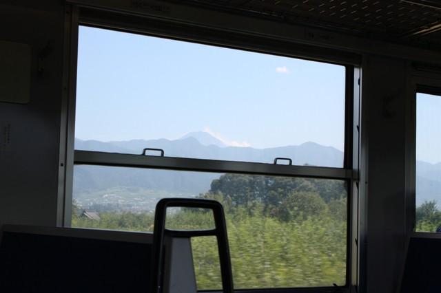 写真は鈍行の車窓から。甲府盆地に入ると富士山の頭が見えます。 -