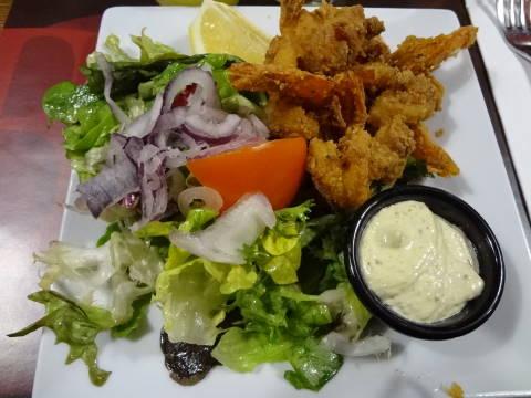スパイスの効いたエビのフリッターとサラダ。
