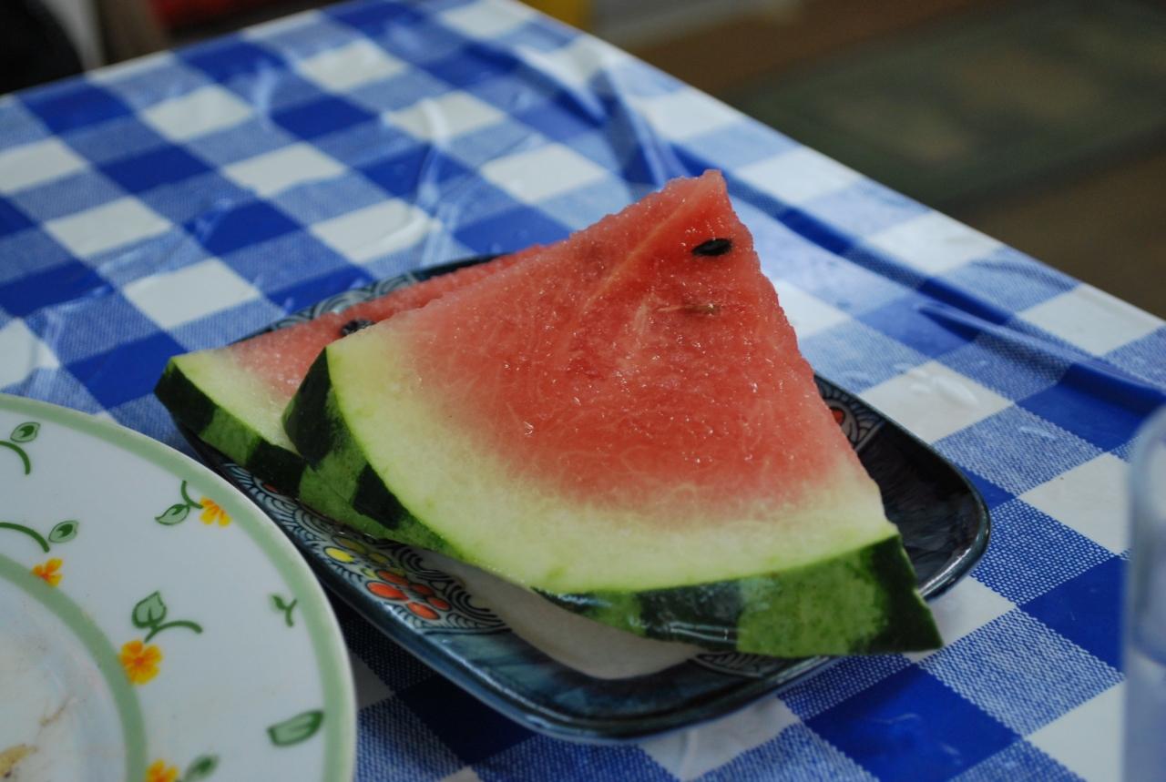 まだまだ食べるぞー。こちらはサービスで差し入れいただいたスイカ。