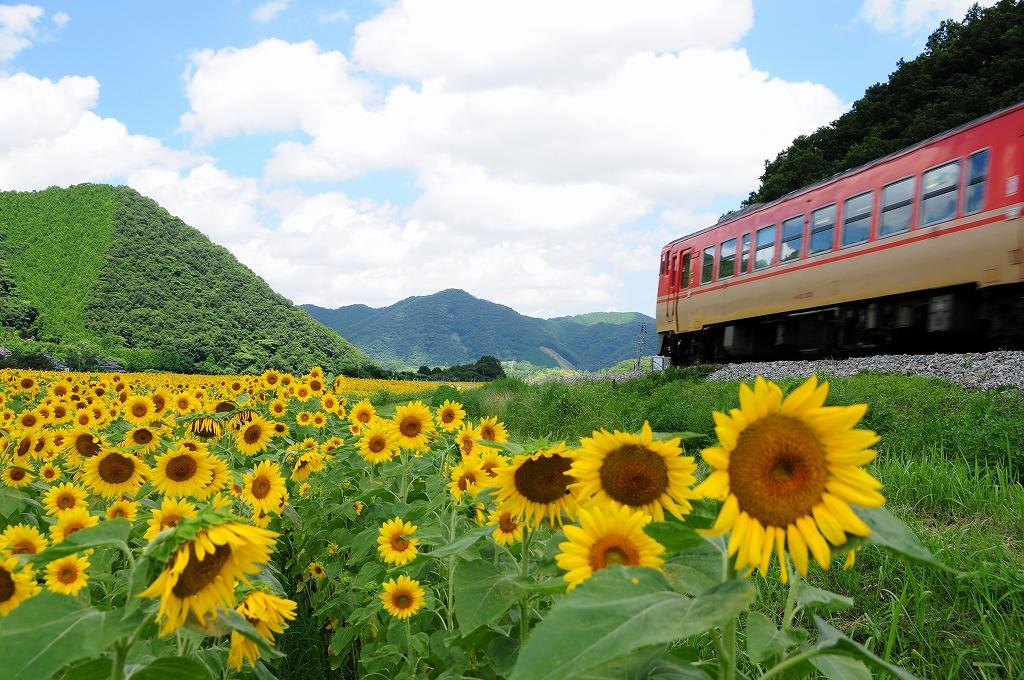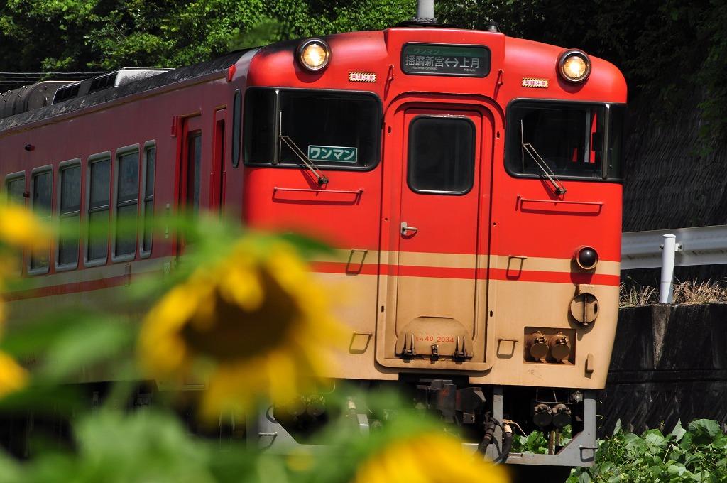 その中を走る姫新線の赤い電車・・・