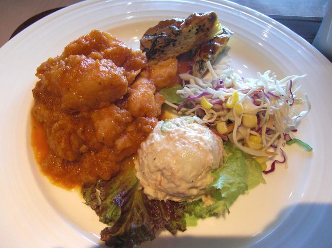 白身魚のトマトソース、スパニッシュオムレツ、コールスローサラダ、ツナポテトサラダのディッシュ。コーンポタージュ。パン。ドリンクのチョイス。のセットで1000円でした。 -