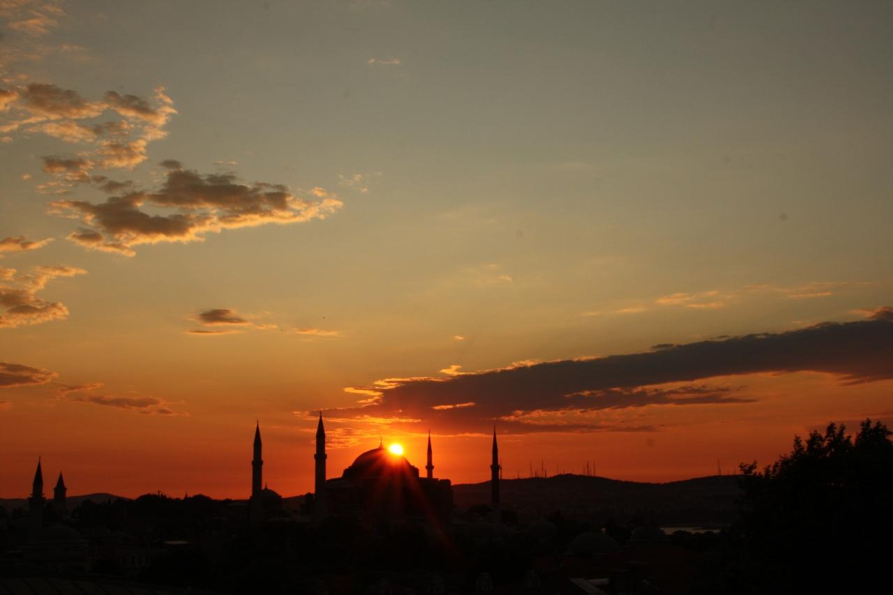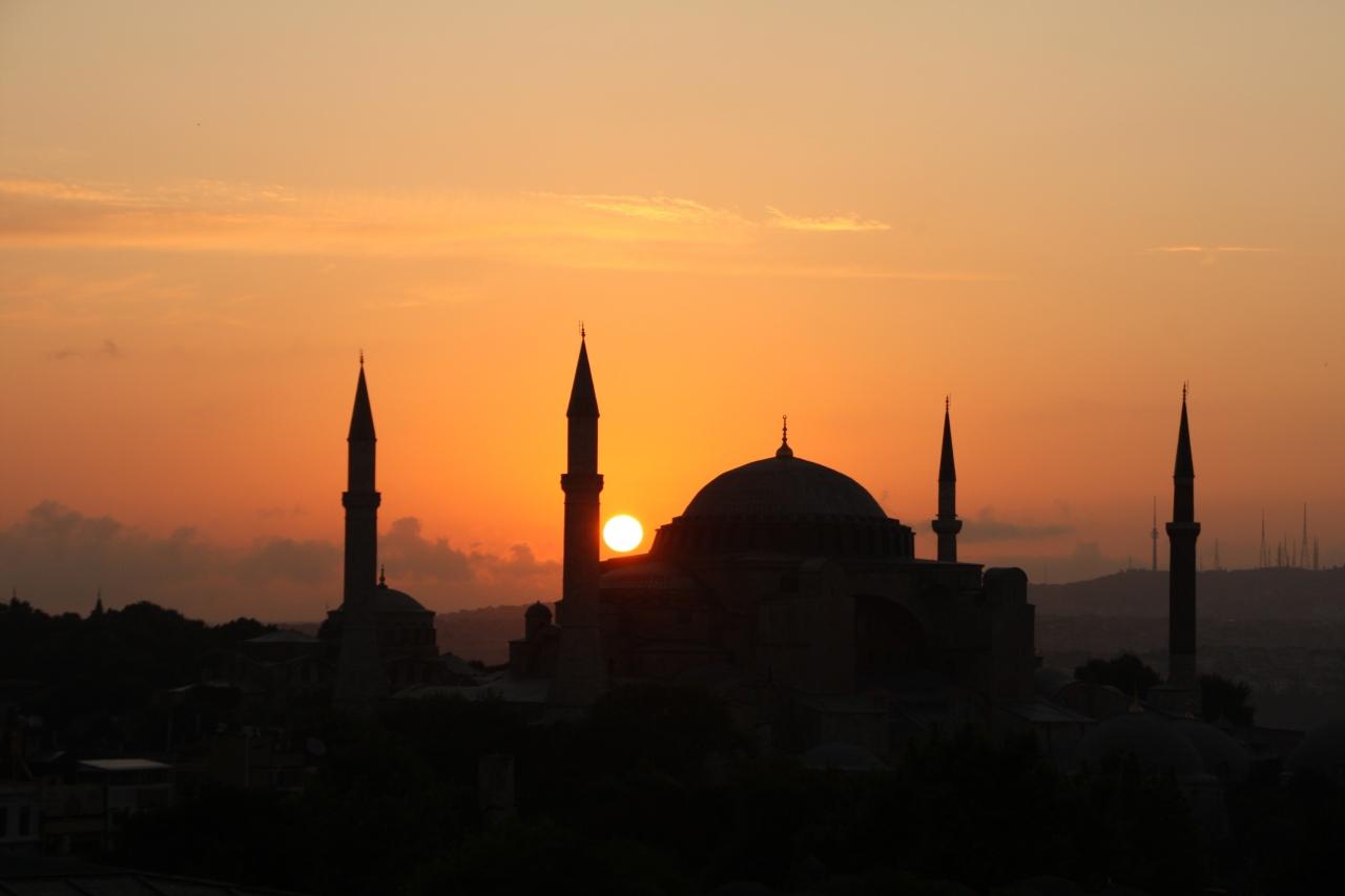 写真は4本のミナーレの真ん中、大ドームに朝陽が昇り、神々しいシルエットを醸し出す「アヤソフィア」大聖堂!!